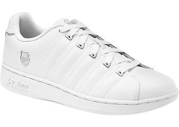 The K-Swiss® Albury II men's classic shoe features a chic, retro style for on and off the court. The signature stitched-on stripe detailing and embroidered logo accents provide the style you love, and the two-tone metal D-Ring lacing system ensures a lockdown fit.